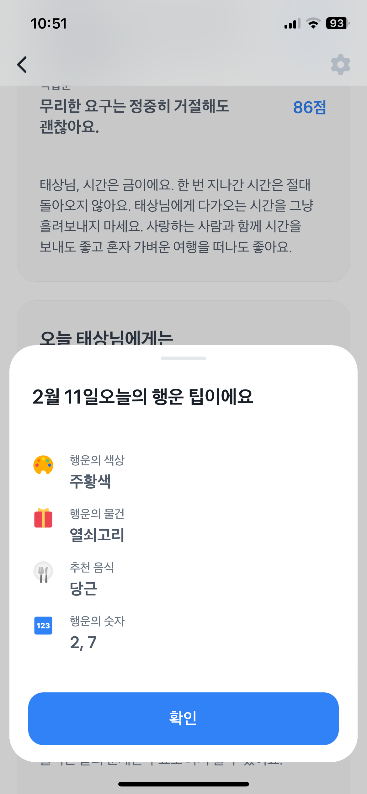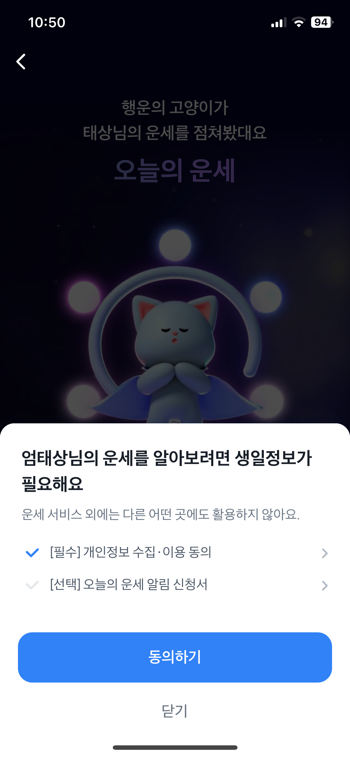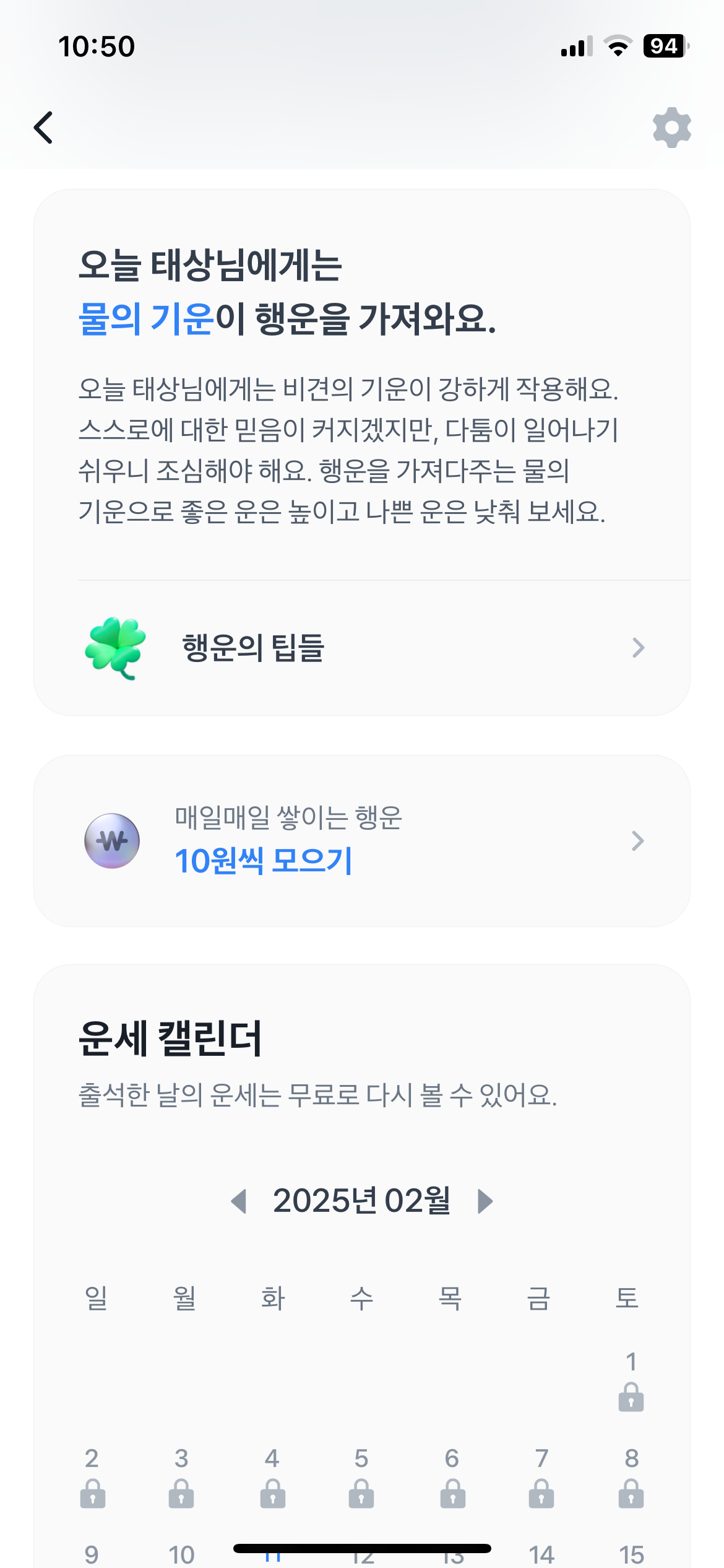 이렇게 물의 기운도 충만하다는 친절한 덕담까지 해준 다음, 행운의 팁 버튼을 누르면 오늘 행운이 깃들어 있는 색깔, 숫자, 음식 등 친절하게 추천까지 해준다. 운세를 중요하게 생각하는 사람의 유입을 지속적으로 도모하기 위해서 이렇게 운세 출석 캘린더 까지 추가해 놓았다. 이게 끝인가? 정말 전달이 목적인가? 하는 생각이 들 때쯤, 신박한 버튼을 발견하였다.
