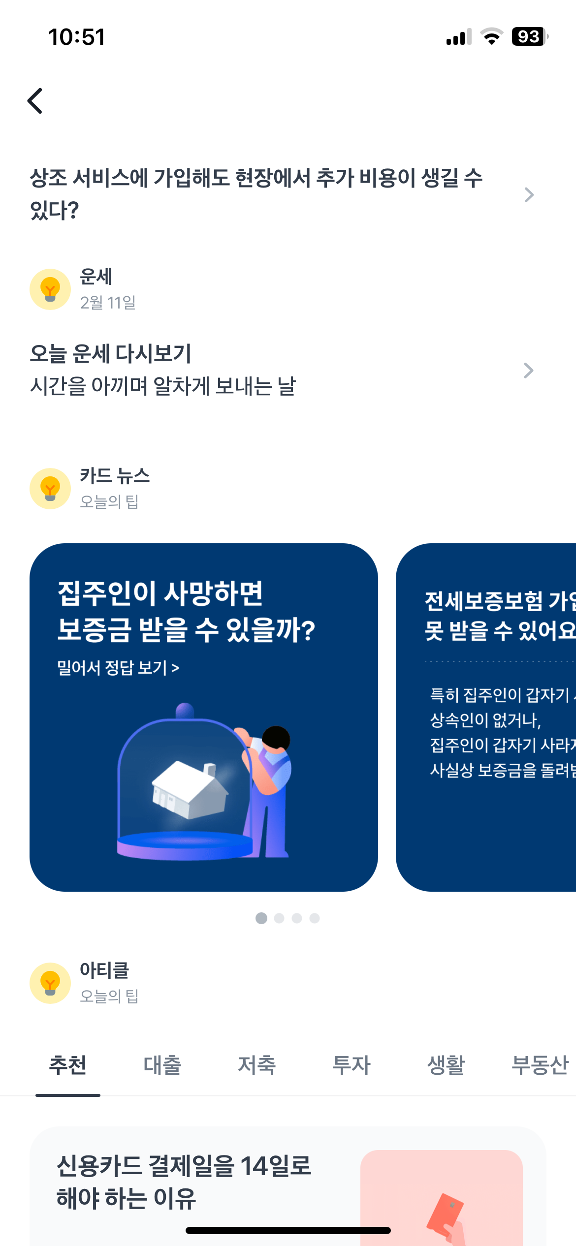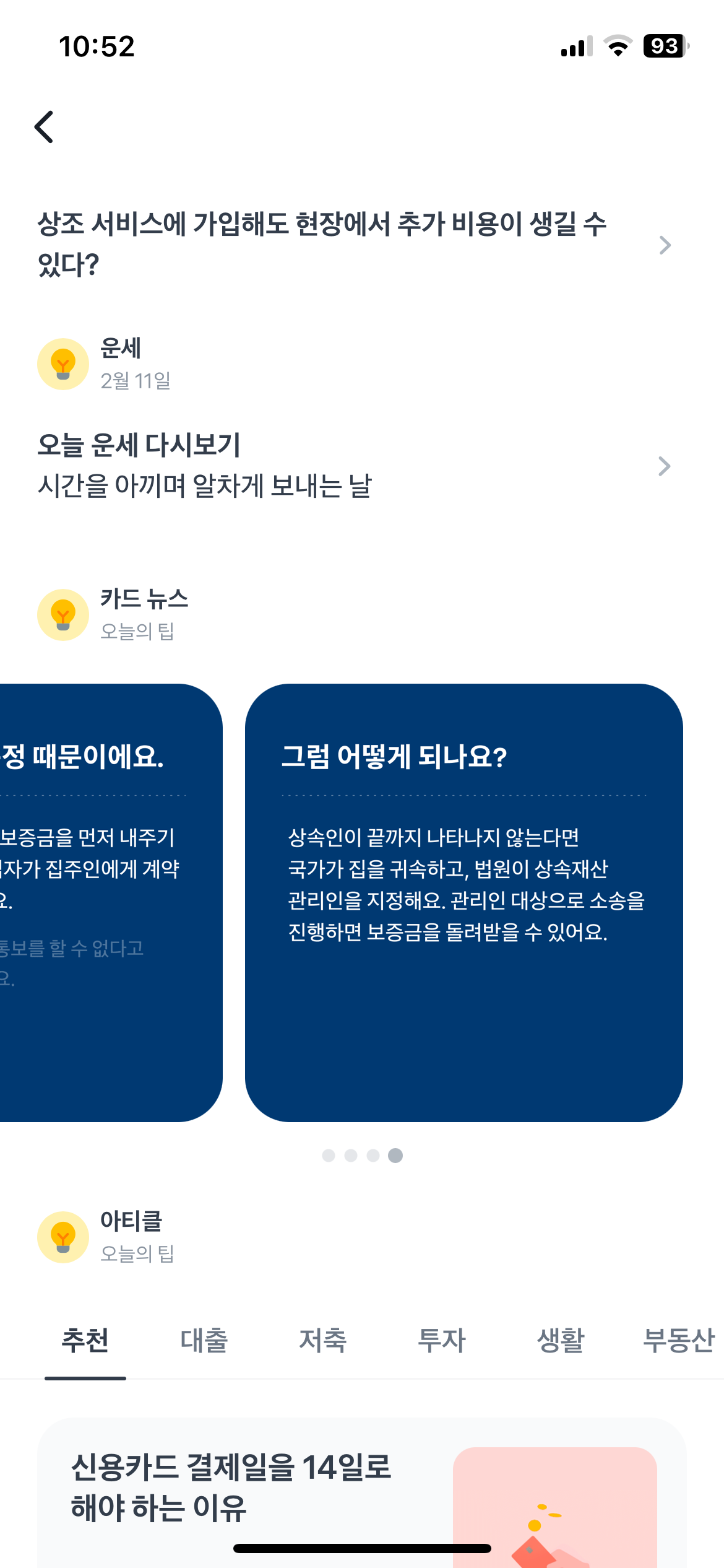 이런 전세보증금 같은 문제는 정말로 사회초년생들에게, 어쩌면 전 국민에게 중요한 문제라고 생각했고, 본인 또한 조만간 아주 중요하게 생각해봐야 할 문제였지만, 이렇게 오늘의 팁 라운지에 들어가는 것 만으로도 어느정도 정보를 얻어버렸다. 정보를 얻음 당했다 라는 표현이 적절할 정도로 아주 라이트하게 머릿속으로 휙 들어오는 효과가 있었다. 다만 클릭을 통해 화면이 전환되는 효과는 없었고, 옆으로 스크롤을 통해 간단하게 확인할 수 있었다.