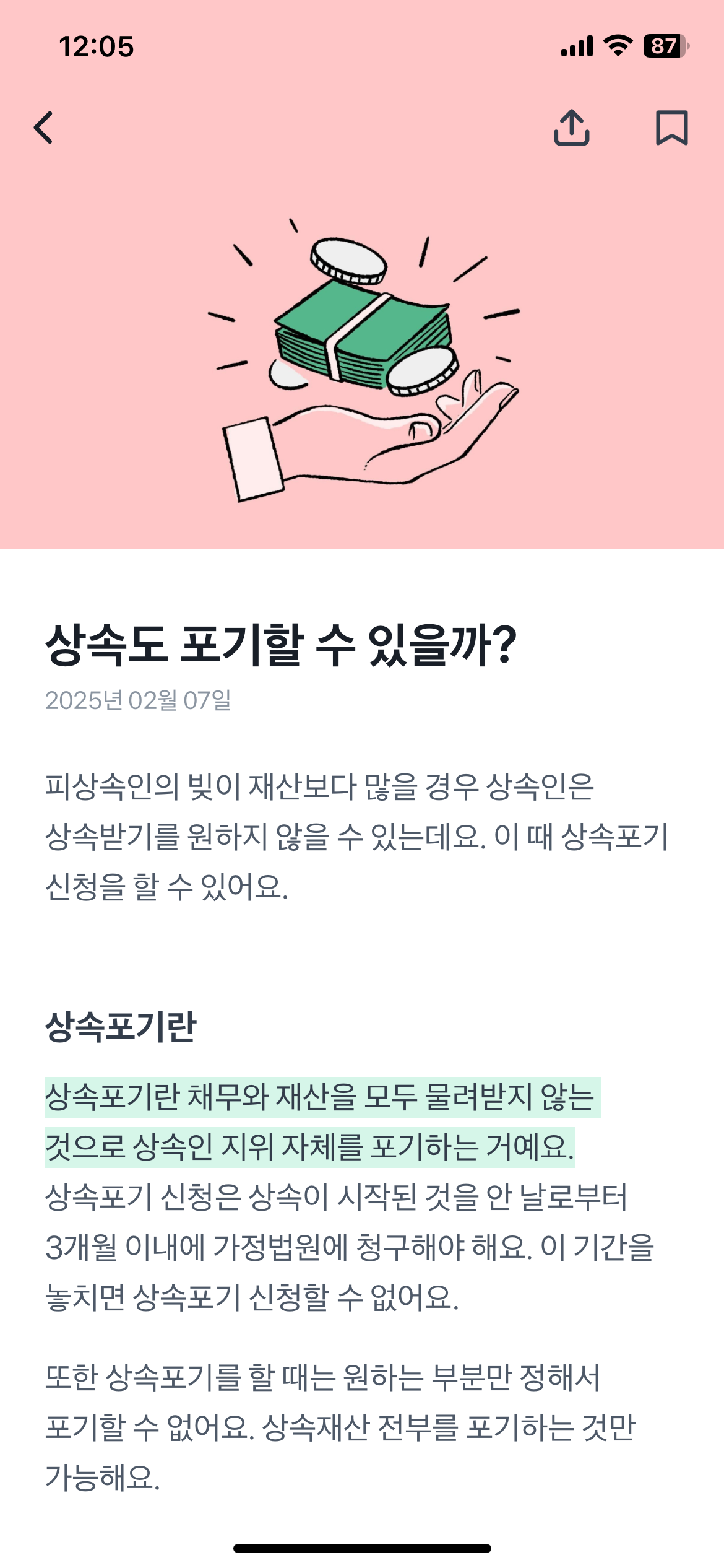 서비스 벤치마킹을 끝내고 앱을 닫은지 채 1분도 되지 않아 이런 알림이 울렸다. 상속포기와 관련된 궁금한 질문을 던지며 터치를 유도하는데 클릭을 안할 수가 없었다. 클릭해보니, 이렇게 아까 본것 처럼 아티클로 넘어가게 되었다. 개인적으로 계속 라운지에 머무르는 시간을 늘려주는 좋은 기획이라고 생각한다. 다만, 개발 쪽의 프론트엔트(앱) 단에서 이렇게 조건이 없는 비조건부 푸시를 날리는 것이 굉장히 까다로운데, 개인적으로 토스 개발자 분들의 엄청난 노고가 느껴졌다..