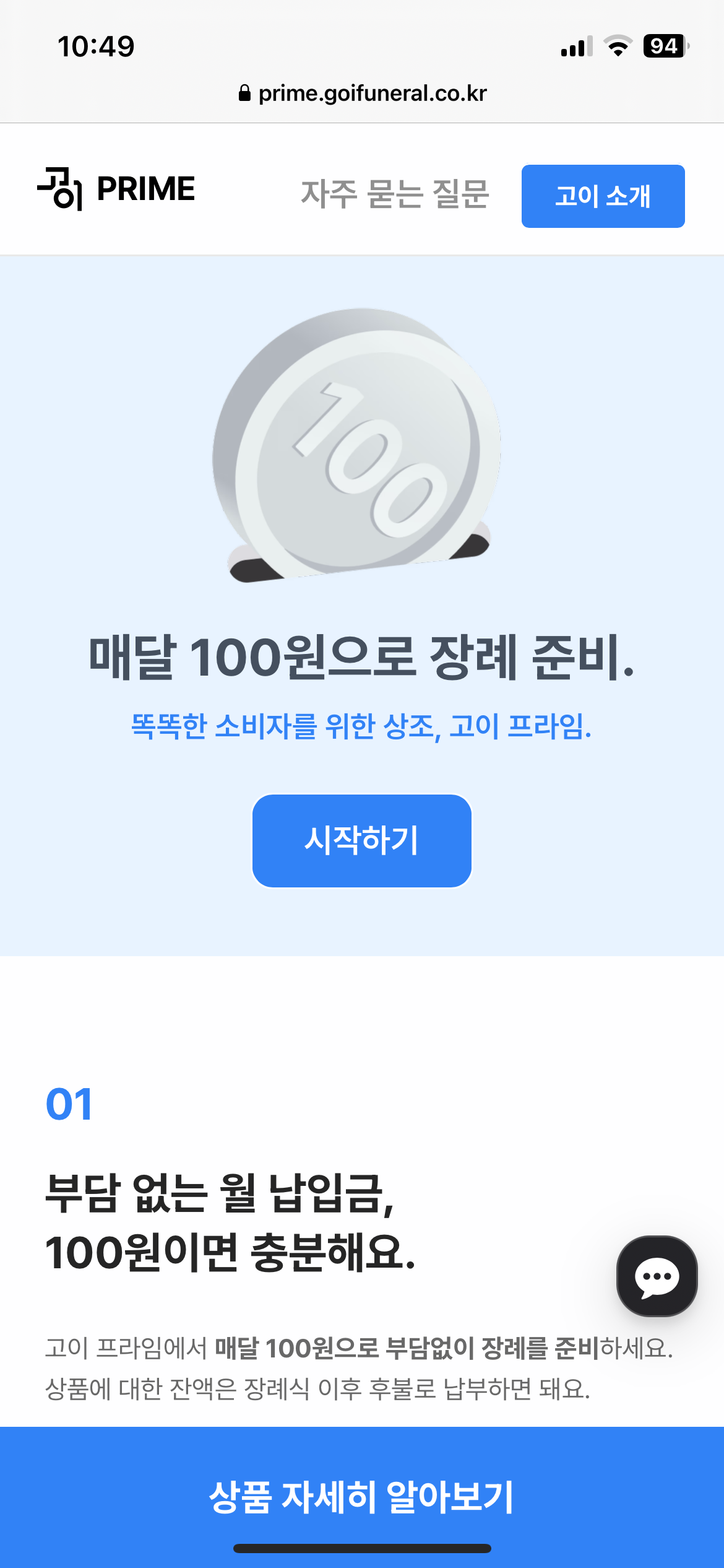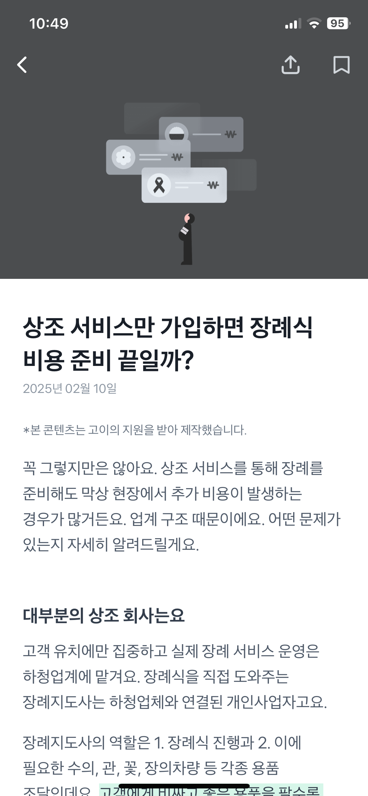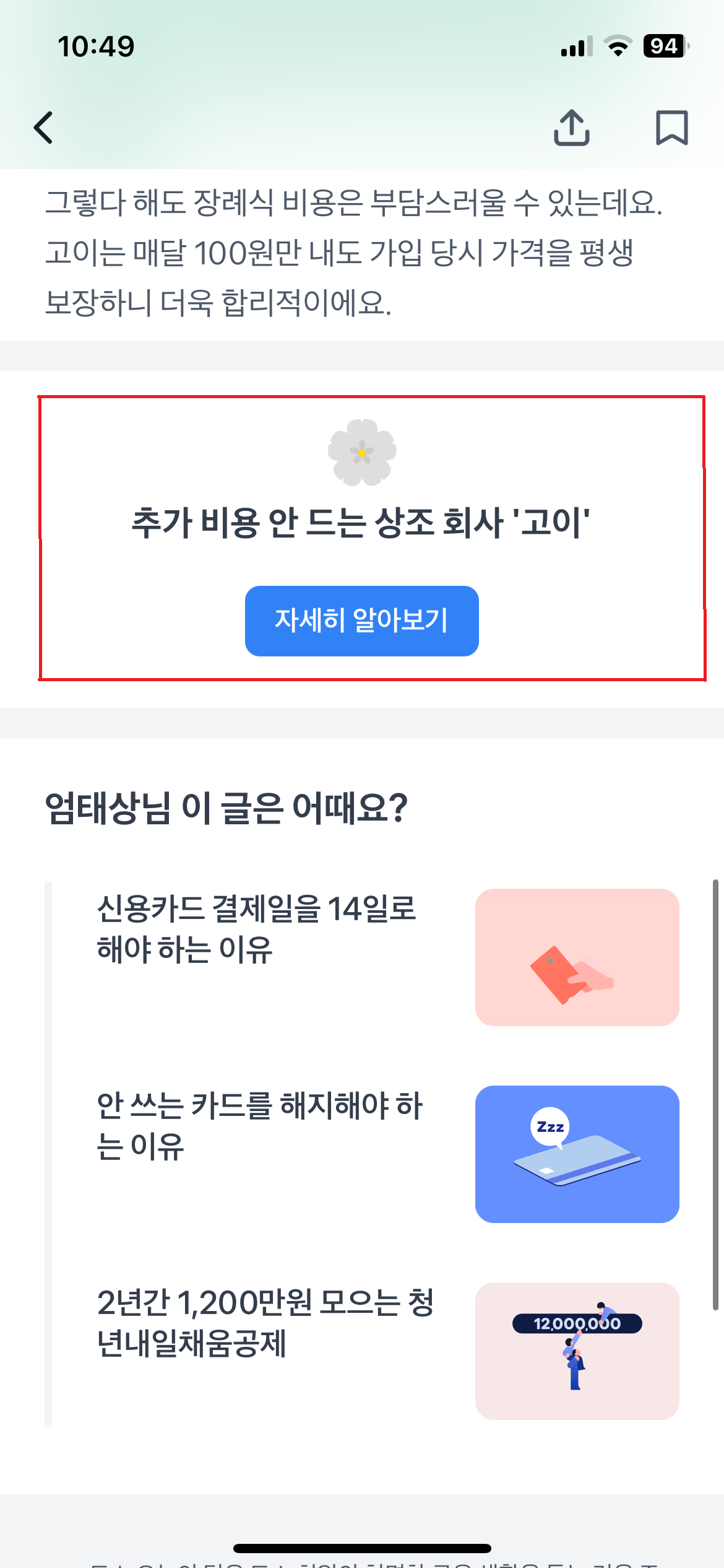 사실 놀라운 점은 이 아랫부분이다. 단순히 정보 전달에서 끝나는 게 아닌, 정보의 내용을 잘 전달한 후, 이에 대한 대안을 가지고 나왔다. 여기에서는 '고이' 라는 상조회사의 페이지로 이동할 수 있는데, 상조 서비스에 대한 추가 비용을 우려한 사용자에게 이렇게 미리 매달 100원씩 남입하는 미리 준비하는 장례 서비스로 그 대안과 광고를 함께 제시했다. 광고라고 생각할 틈도 없이 이렇게 홀린 듯이 자연스럽게 유입하게 만드는 이 전략에 참 감탄이 나왔다. 이런 세부적인 것까지 생각하며 전략을 세우는 구나 하는 존경심도 들었다.