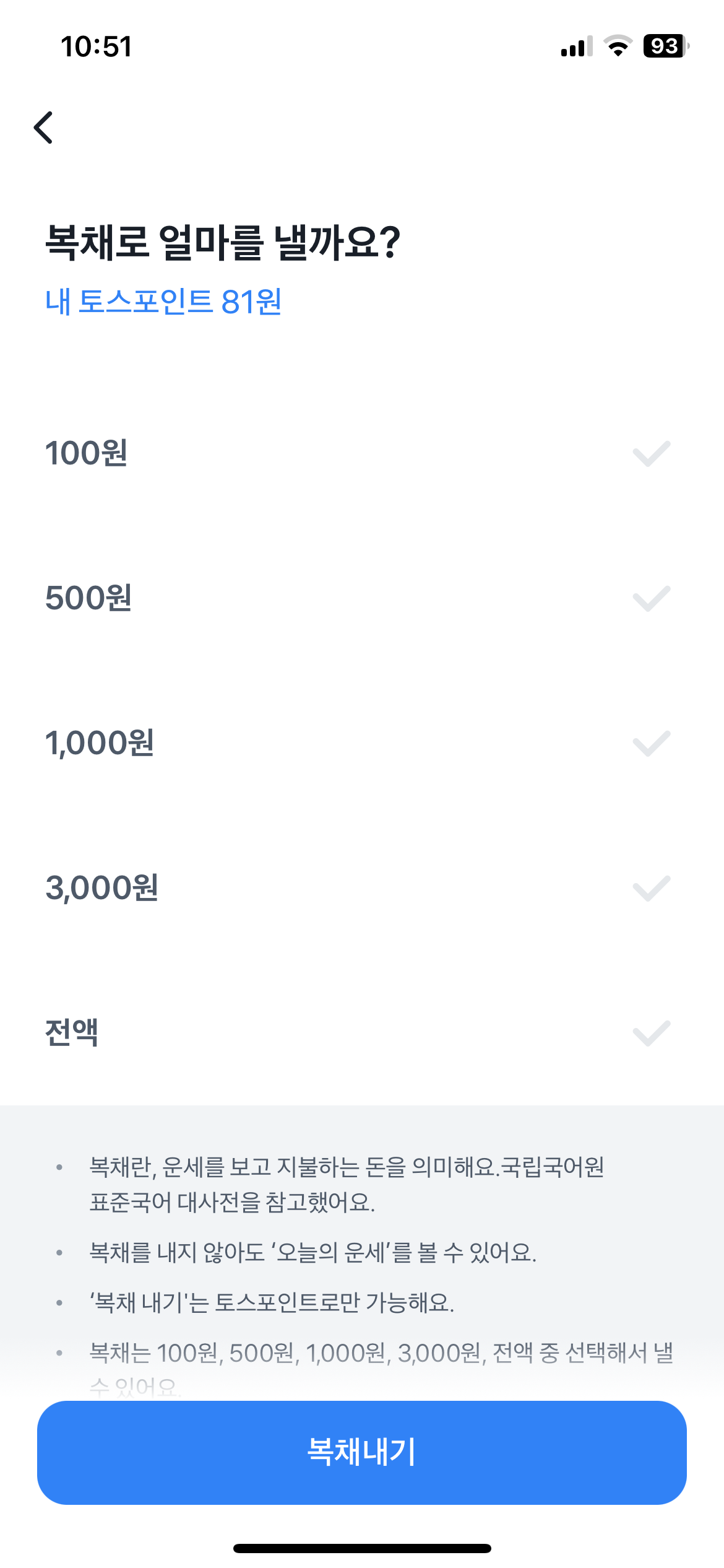 바로 복채를 낼 수 있다는 것. 아까 캘린더에 이어서 매일 운세를 알람받기로 받아볼 수도 있었다. 일단 은복이에게 복채를 낼 수 있다는 말에 클릭하여 들어가 보았더니, 이렇게 내 토스포인트로 복채를 낼 수가 있었다. 굳이 내지 않아도 운세를 볼 수는 있지만, 이렇게 자유로운 기부 기능까지 넣어 놓은 것을 보니, 복채를 내면 어떠한 혜택이 있는 것인지, 그저 기부금인 것인지 궁금했다. 하지만 나의 토스 포인트가 부족하여 복채를 내지는 못했다. 하지만 이렇게 부족한 포인트도 여러 미션을 수행하면 즉석으로 채울 수 있게 해 놓은 것을 보니 또 자연스러운 유입전략이 보였다. 이렇게 어느정도 토스포인트를 회수하는 기능까지 자연스럽게 들어가 있었다.