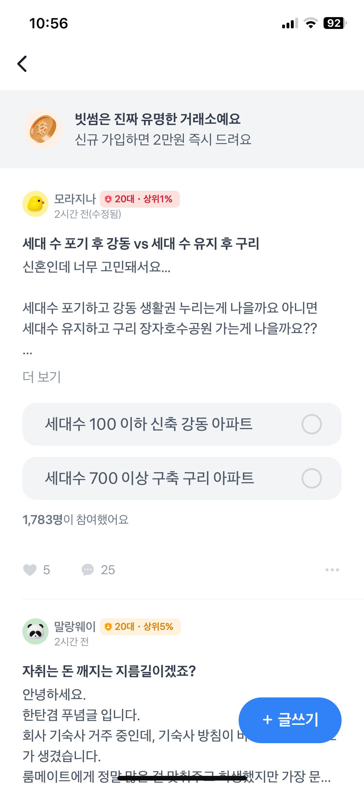 이 머니 라운지는 기능이 간단했는데, 예전 카카오스토리 처럼 구성되어 있는 익명의 사람들의 금융 고민들을 SNS 처럼 올릴 수 있는 기능이었다. 이렇게 닉네임과 프로필 사진까지 구성하여, 이모티콘 혹은 댓글을 남길 수 있었다. 댓글을 일일히 관리하는 지는 모르겠지만, 글과 댓글을 정말 공손하고 매너있는 것들밖에 없어서 보기가 편했다.