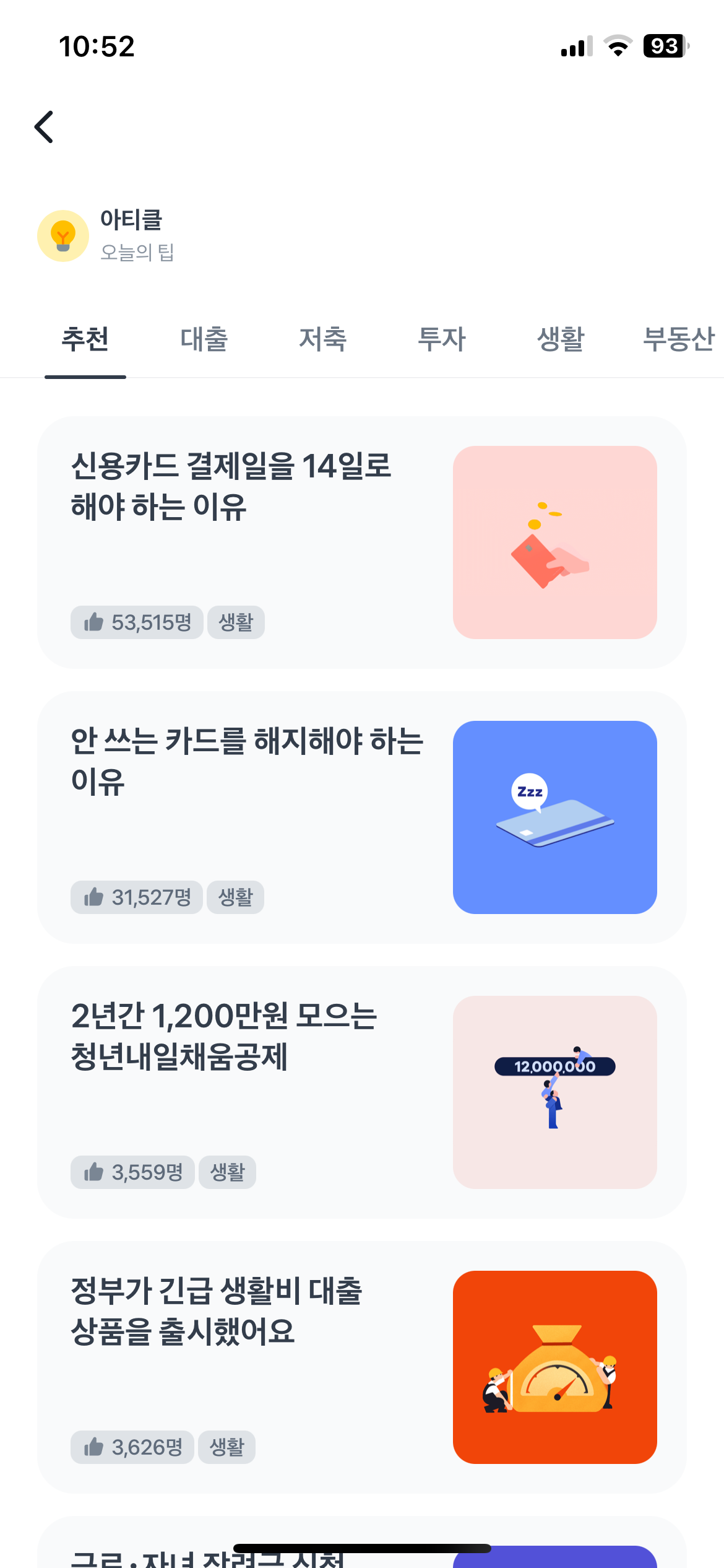 이제는 대망의 아티클 기능이다. 사실 오늘의 팁 라운지에서 가장 메인이 되는 부분이다. 이렇게 깔끔한 디자인으로 관심이 갈 만한 금융상식들을 모아놓아서 클릭을 할 수 밖에 없었다.
