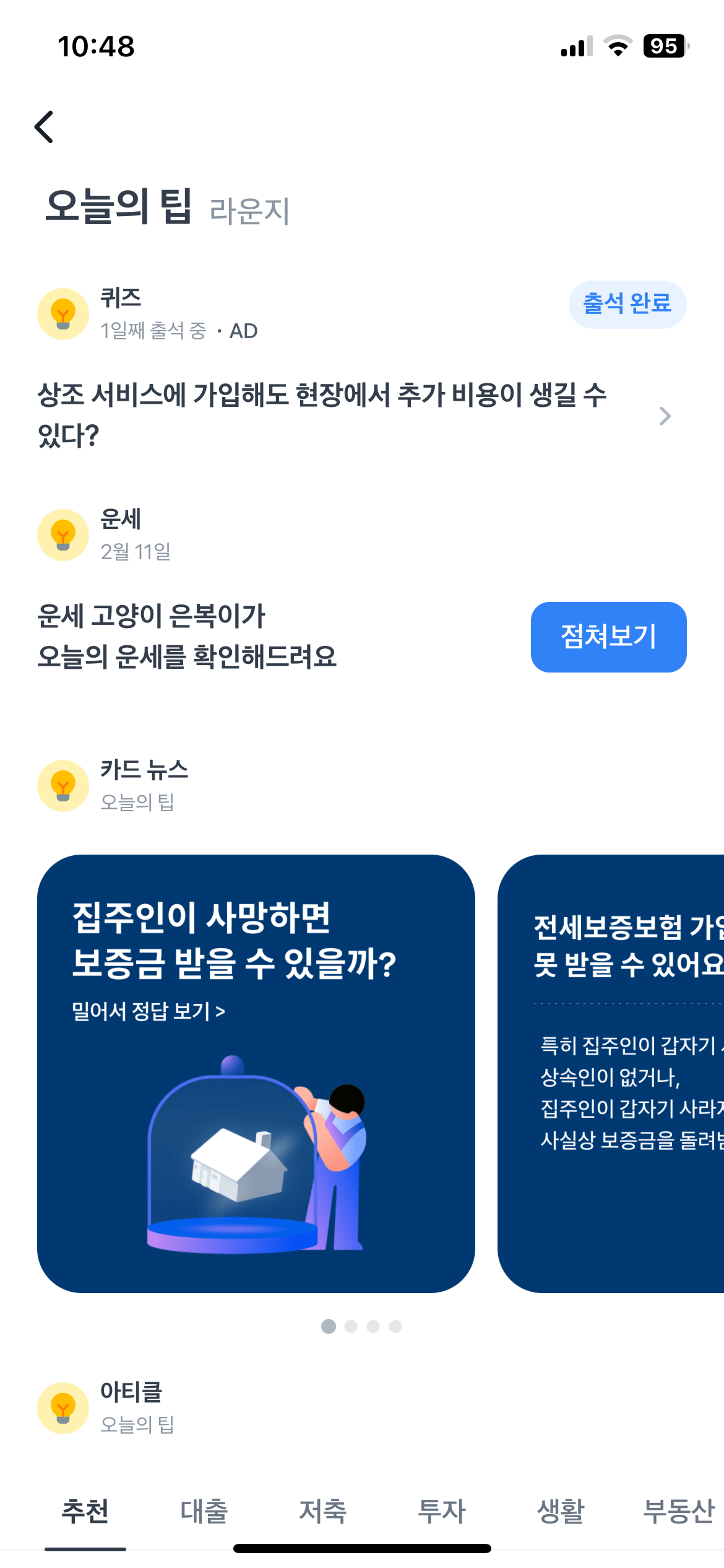 '오늘의 팁' 은 토스가 여러 금융상식들을 카드뉴스, 퀴즈, 아티클, 운세 같은 형식으로 라이트하게 사용자에게 전달하는 라운지 같은 느낌의 기능이다. 이렇게 금융 앱 마다 이런 금융상식을 전달하는 비슷한 기능은 조금 있는 것 같지만, 토스는 예전부터 이 기능의 선구자 느낌이기도 하고, 그저 정보 전달이 아니라 다른 기능으로의 유입 채널도 자연스럽게 열어놓은 아주 전략적인 서비스이자 기획이라고 생각한다.