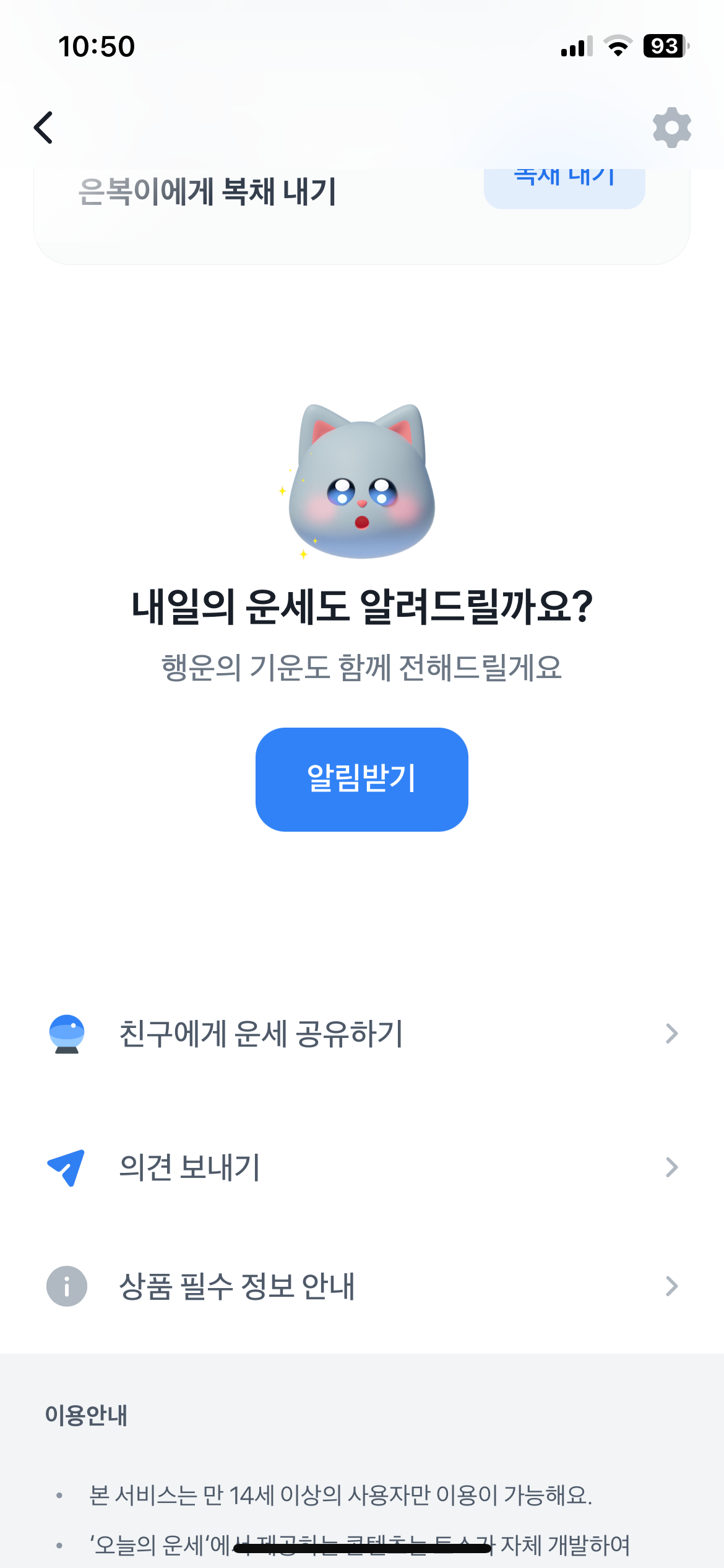 다음은 오늘의 팁 라운지에서 두번째로 배치되어 있는 운세 기능이다. 우리의 운세 고양이 '은복이' 가 오늘의 운세를 점쳐 주는 , 다소 샤머니즘이 가미된 기능이다. 여기서는 또 어떤 전략이 숨겨져 있을지, 설레는 마음으로 운세를 점쳐 보았다.