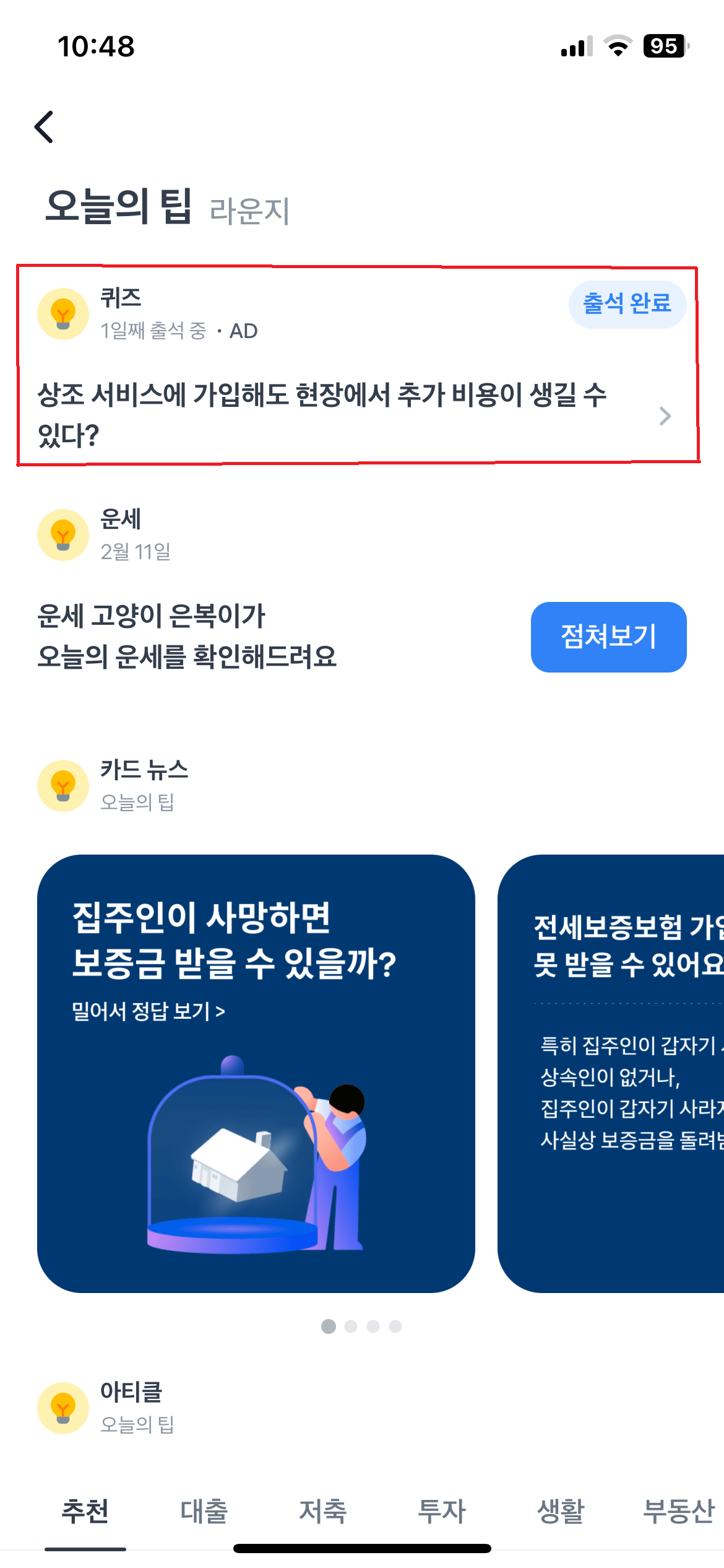 이는 오늘의 팁 기능에 처음 들어갔을 때의 화면이다. 라운지처럼 퀴즈, 오늘의 운세, 카드뉴스, 그리고 금융 정보 아티클이 배치되어 있다. 처음 들어가자마자 느낀 점으로는 아주 깔끔한 UI로 어떤 것을 클릭하더라도 부담이 없게 느껴졌다. 사실 이 라운지까지의 인입 경로도 예전부터 토스가 이런 금융 정보 제공을 한다는 것을 알고 있었고, 맨 위 전체 메뉴에서 오늘의 팁 옆에 금융상식, 아티클 등 이렇게 각 기능에 대한 세부 설명이 간략히 표현되어 있다는 게 좋았다.